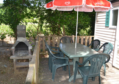 Terrasse : terrasse en bois de 12m² avec son salon de jardin ainsi qu’un barbecue privatif ou plancha électrique, ombragé.