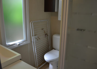 Salle d’eau : 1 douche, 1 lavabo, étagères de rangement et 1 toilette.